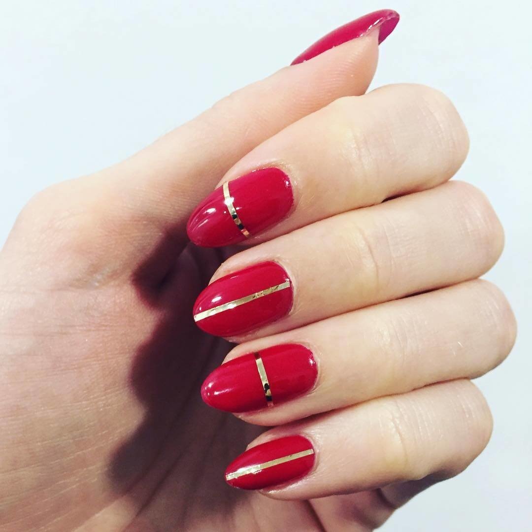 С помощью алого лака успешно визуализируется форма ногтевой пластины. Например, если ногти широкие, лаком покрывают средину ногтя, не задействуя при этом края.
