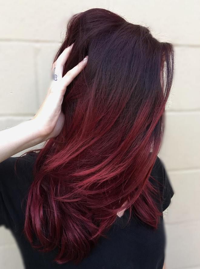 32. Бордовые волосы с эффектом омбре. Красивое сочетание черных корней и длинных темно-бордовых волос. Он не такой огненный, как какой-нибудь ярко-красный, но позволяет вам почувствовать себя резким и альтернативным.
