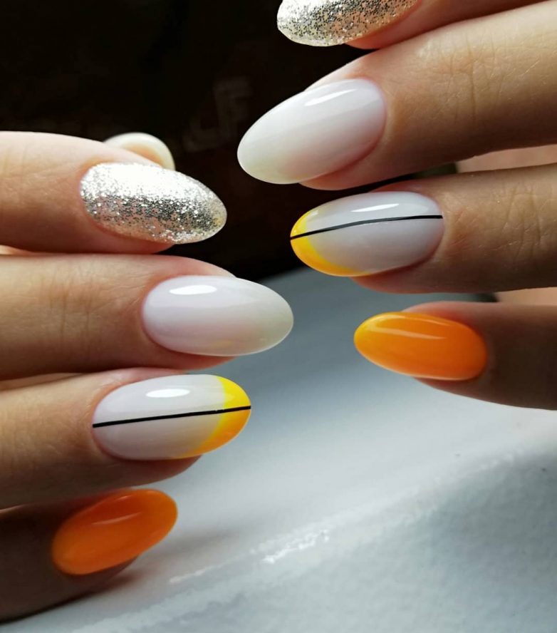 Эффектный ноготь не обязательно должен быть сложным, чтобы произвести впечатление. Этот дизайн использует несколько осенних цветов (оранжевый и серый) и сочетает их с белыми ногтями, нарисованными минималистскими точками и зигзагами.