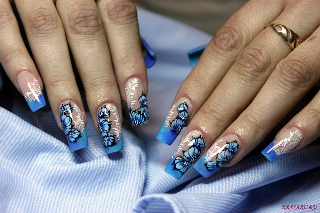 Аквариумный маникюр может содержать цветочные объемные элементы или какой-либо другие изысканные рисунки. Такой дизайн ногтей будет держаться продолжительное время.