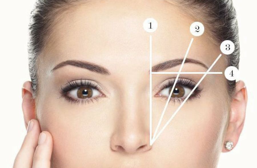 - Излом брови- высшая точка брови, от которой начинается сужение. Теперь линию нужно провести от ноздри до брови через зрачок.