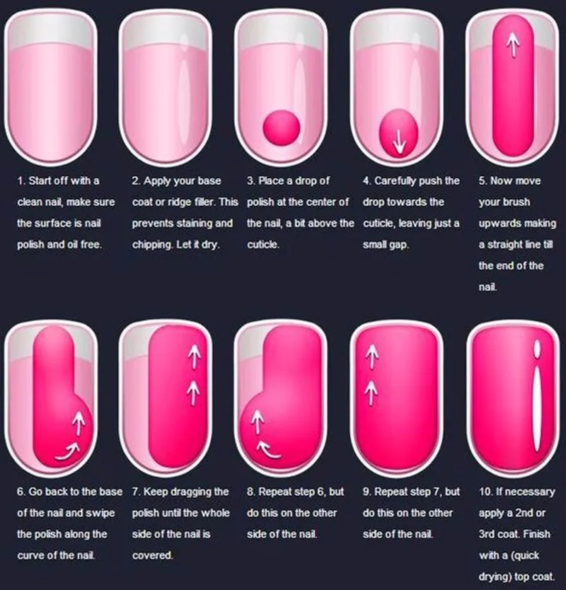 Обязательно запечатывайте кончики ногтей при нанесении каждого слоя (просто проводите кончиком кисточки для лака по кончикам ногтей).