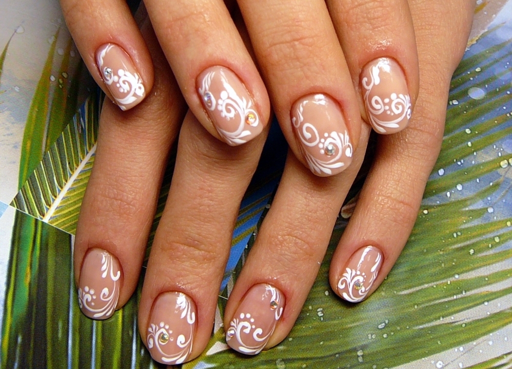 - Нежный маникюр со стразами или блестками