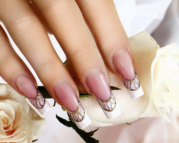 Чтобы сделать модный белый френч с дизайном, экспериментируйте с формой белой линии. Популярное решение — изобразить на кончике ногтя цветок, вензель или сердечко. Такой маникюр часто предпочитают невесты, потому что он выглядит нежно и романтично.