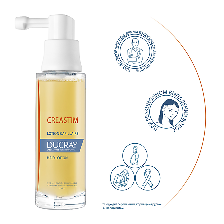 Лосьон против выпадения волос Дюкрэ Креастим значительно уменьшает реакционное выпадение волос: после беременности, стресса, переутомления, и стимулирует рост новых.