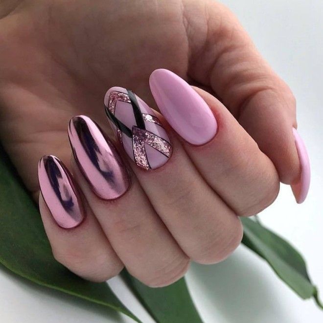 Не менее популярен нейл-арт с эффектом зеркального блеска, который является воплощением стиля, элегантности и совершенства. Но не зацикливайтесь только на этой технике, добавьте разнообразие в дизайн, с помощью другой техники или предметов декора.