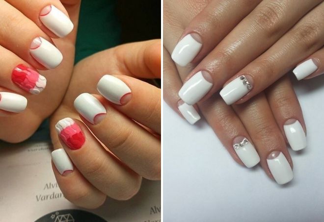Дополнять белый маникюр можно любыми оттенками; правда, нужно понимать, что яркие цвета создадут контраст, а пастельные почти не будут выделяться на белом фоне. Что касается текстур, то здесь можно свободно экспериментировать: глянцевый белый хорошо сочетается и с матовым покрытием, и с шиммером, и с глиттером, и с эффектом металлик.