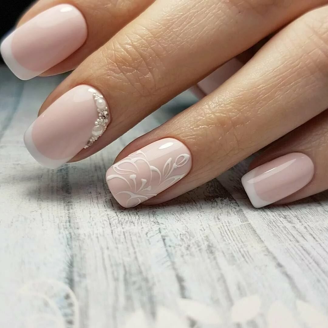 Красиво выглядит нежный маникюр во французском стиле с лепкой, либо росписью в виде рисунка, ажурного узора.