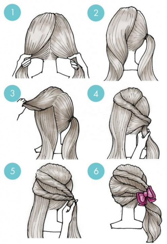 Причёска легко фиксируется невидимками или шпильками и покрывается лёгким слоем лака. Если волосы ниже средней длины, то же самое можно выполнить из не очень тугих косичек, заплетённых от висков и собранных на затылке в хвостик, из которого впоследствии делается небрежный пучок.