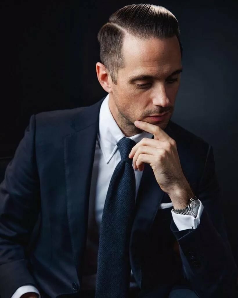 Классика — самая популярная стрижка. Это, своего рода, «воспоминание» модной мужской прически 1950 года, когда все волосы спереди зачесываются назад, но немного откланяются в одну сторону. Для поддержания волос в таком положении необходимо использование любого средства для укладки.