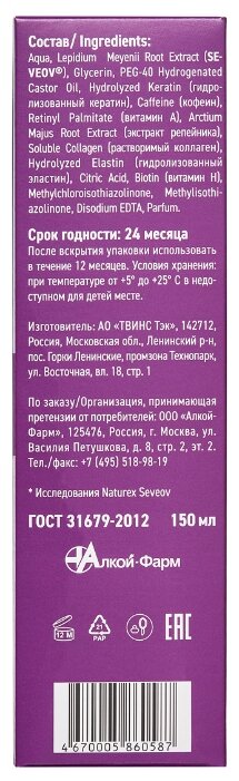 Aqua, Glycerin lepidium Meyenii Root Extract (Sеveov-), Glycerin, PEG-40 Hydrogenated Castor Oil, Keratin (креатин), Caffeine (кофеин), Parfume, Retinyl Palmitate (витамин А), Arctium Majus Root Extract (экстракт репейника), Hydrolyzed Collagen (коллаген), Citric Acid, Methylchloroisothiazolinone, Methylisothiazolinone, Disodium EDTA, Biotin (биотин)