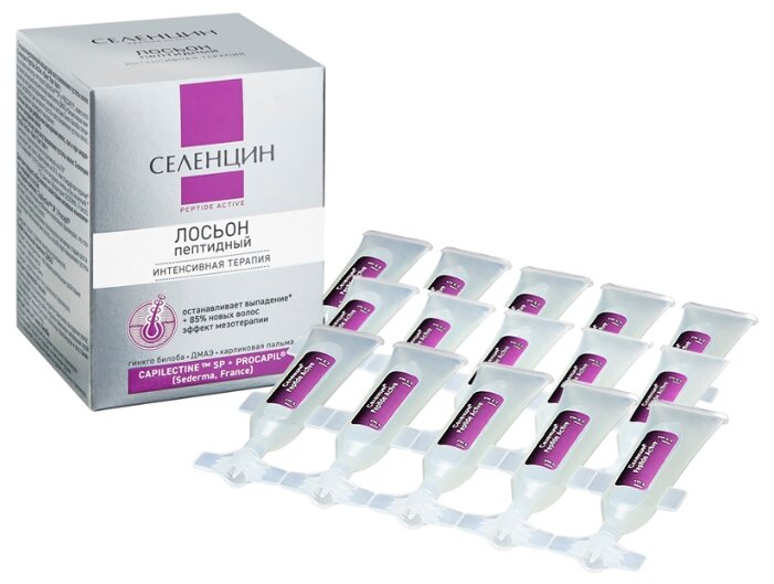 Anageline- — запатентованный активный ингредиент компании Silab (Франция), получаемый из сладкого белого люпина, — основное действующее вещество специализированной косметической линейки Селенцин «HairTherapy». Anageline- регулирует местно гормональный баланс, за счет уменьшения активности 5 -reductase II, стимулирует клеточный метаболизм, за счет увеличения действия фермента — 1 transglutaminase и активизирует образование новых кровеносных сосудов, за счет синтеза фактора роста сосудистого эндотелия — VEGF. Таким образом — Anageline- увеличивает густоту волос и эффективно борется с выпадением волос. Кофеин — природный стимулятор роста волос, мощный антиоксидант, усиливает кровоток, способствует притоку питательных веществ непосредственно к волосяным луковицам, продлевает фазу роста волос и препятствует их чрезмерному выпадению Экстракт хмеля -восстанавливает гидролипидный баланс кожи головы, питает волосы витаминами и микроэлементами необходимыми для их роста, восстанавливает структуру волос, предотвращает избыточное выпадение, придает им здоровый внешний вид; Экстракт крапивы — укрепляет волосы, стимулирует их рост, предупреждает ломкость и сечение волос; Гидролизат коллагена — восстанавливает поврежденную оболочку волоса и его внутреннюю структуру, придает волосам эластичность и блеск; Витамин А — стимулирует синтез коллагена, способствует росту волос, делает их более упругими и помогает противостоять действию неблагоприятных факторов внешней среды, Биотин — восстанавливает глубокие слои волоса, предотвращает появление секущихся концов.