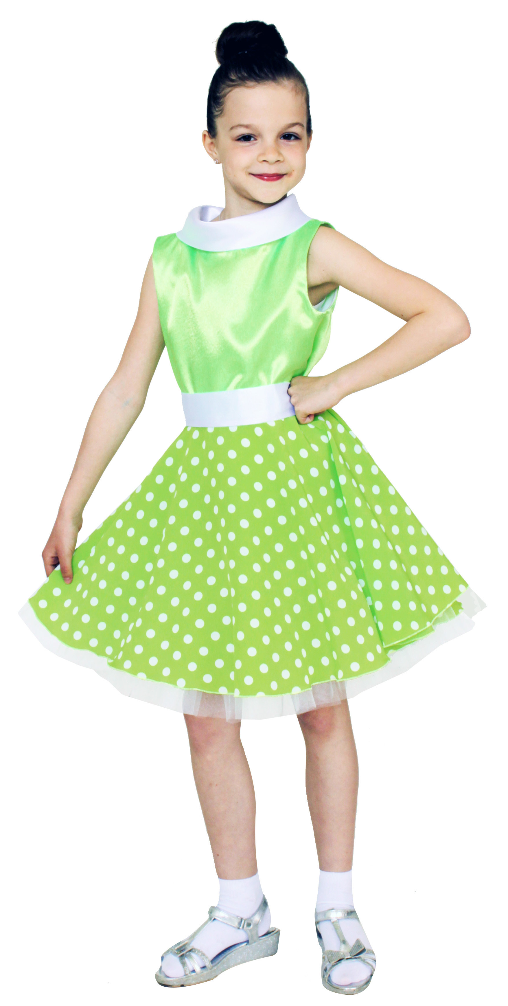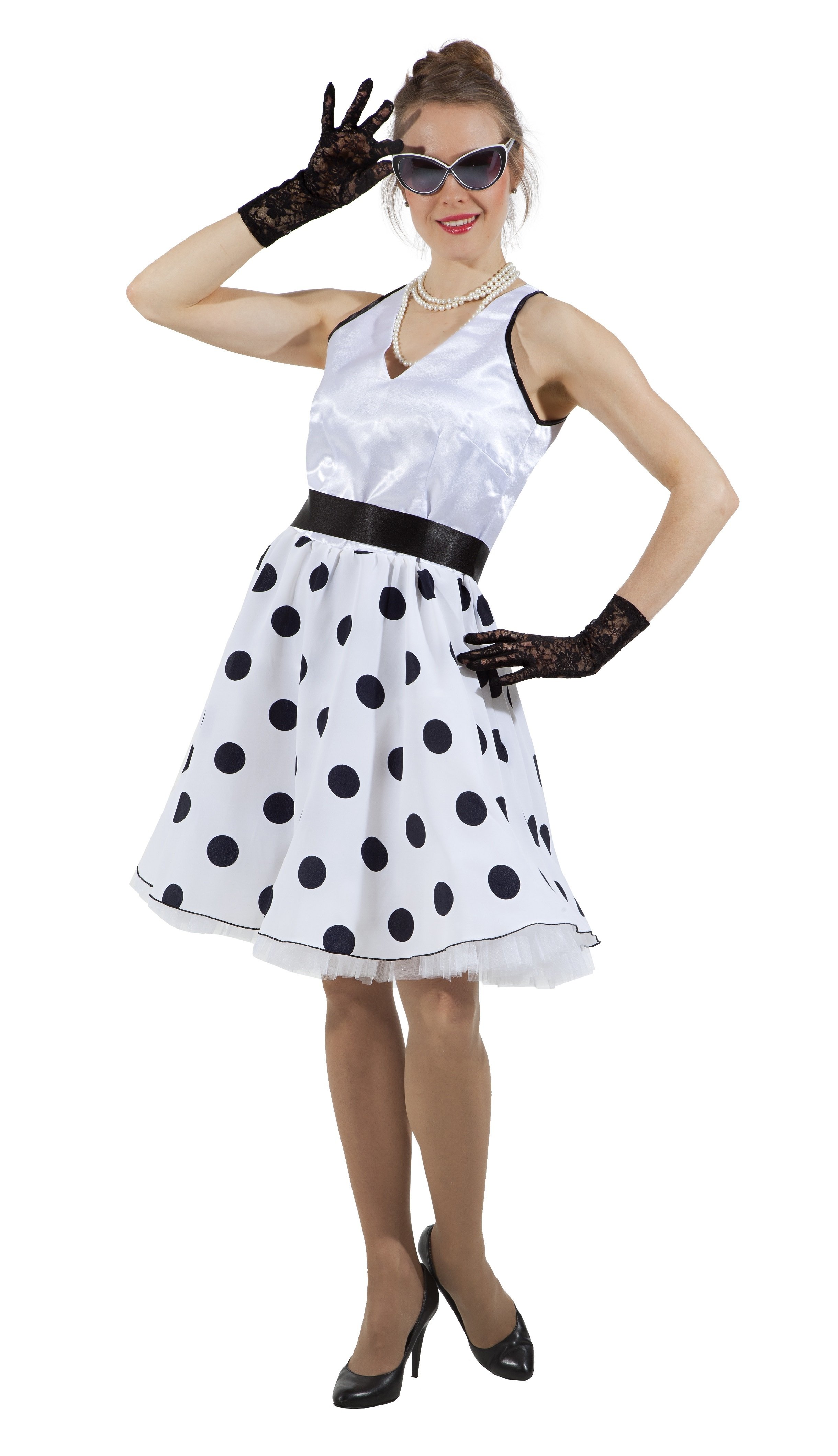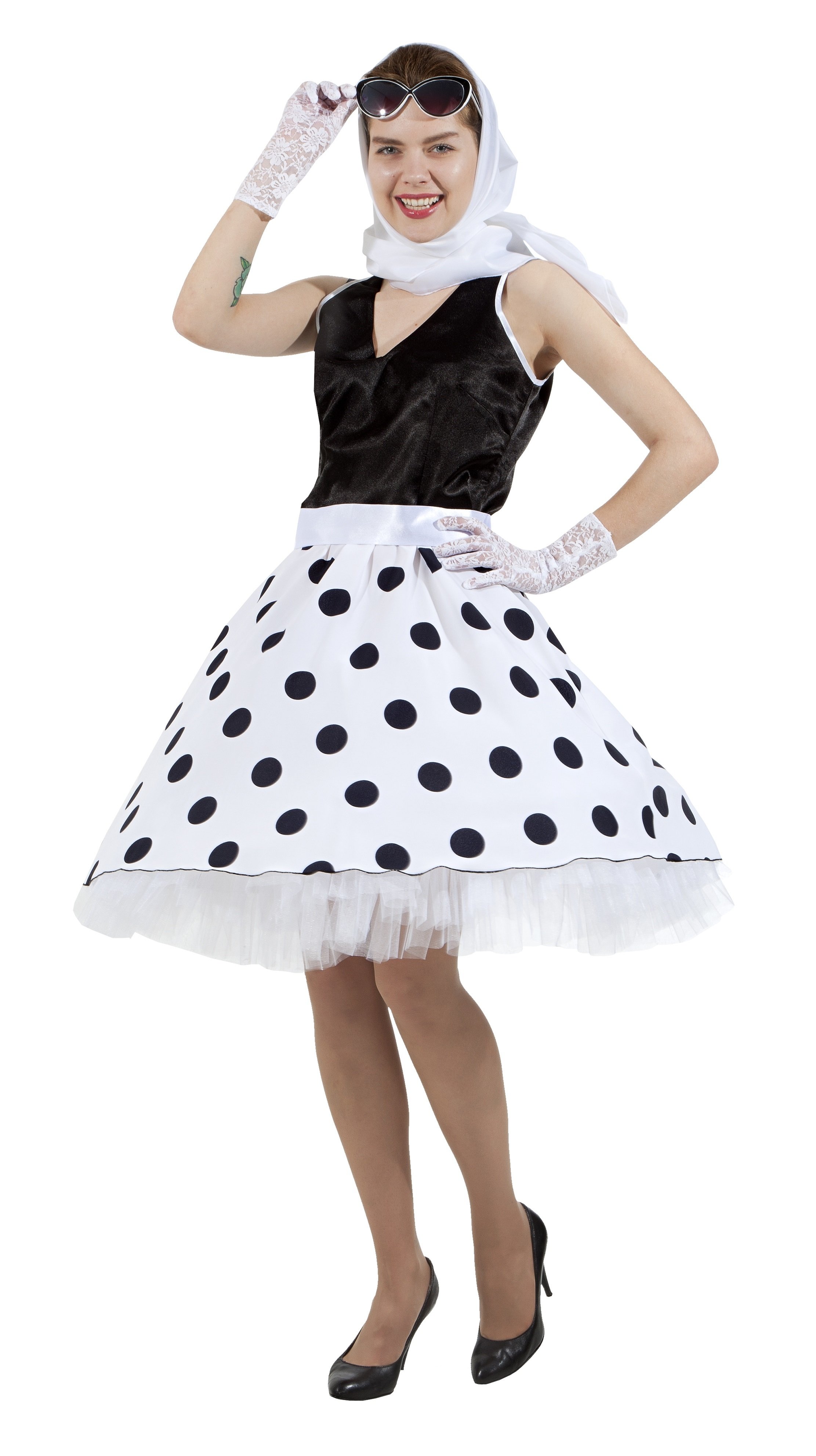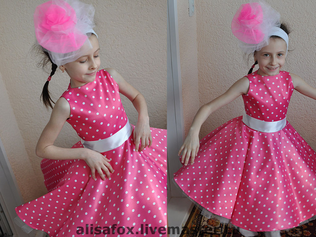 Отлично подойдет высокий начес из волос, который можно дополнить яркой ленточкой или обручем. Платье следует выбрать как можно пышнее и ярче, поэтому будет необходимо приобрести несколько подъюбников. Особое внимание следует уделить платьям и юбкам в горошек.