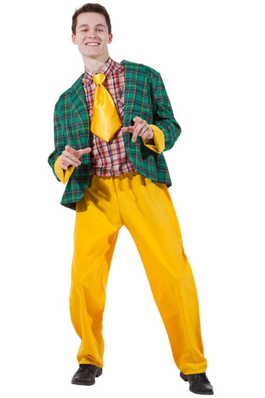 Мужчинам, для создания образа Стиляг, необходимо найти костюм в ярких тонах. Брюки могут быть как с широкими штанинами, так и зауженного фасона. Разнообразить образ поможет широкий контрастный галстук.
