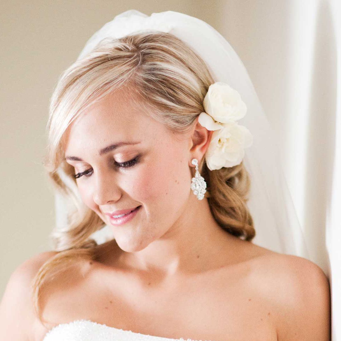У девушек с волосами чуть ниже плеч не менее большой выбор свадебных причёсок: