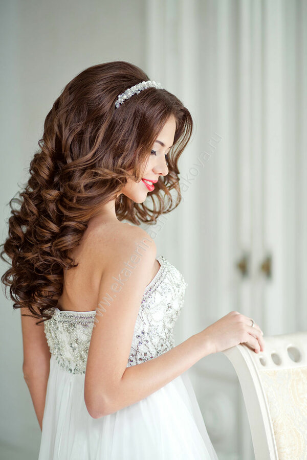 Натуральный вид такой прически придает романтичности и легкости невесте. Завитушки сделают её стиль воздушным и запоминающимся. Слегка можно подрегулировать длину прядей чтобы добиться разной степени завивки. В любом случае, кудрявые волосы, украшенные сияющей диадемой, будут просто сногшибательно смотреться на девушке.