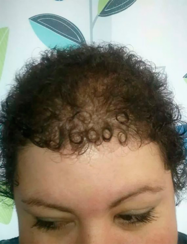 Клиническая картина заболевания представлена очагами тотальной алопеции неправильной формы (залысины могут локализоваться там, где есть волосы, но чаще на темени и макушке) либо участками с разреженными волосами (в этом случае определяются волосы, обломанные на разной высоте, с расщепленным кончиками, или свернутые в колечки).