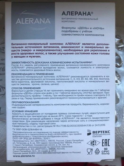 В состав витаминно-минерального комплекса «Алерана» входят формулы «День» и «Ночь», которые включают в себя множество полезных веществ и витаминов.