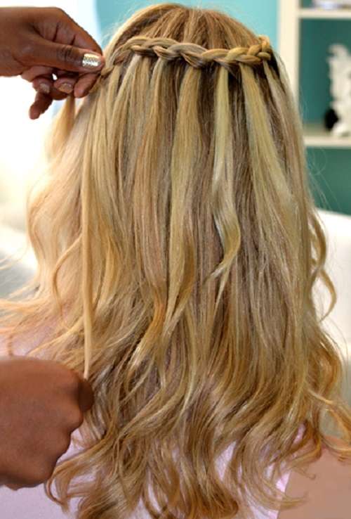 Водопад — это коса со струящимися локонами, отдельные пряди проходя сквозь плетение остаются свободно свисающими.