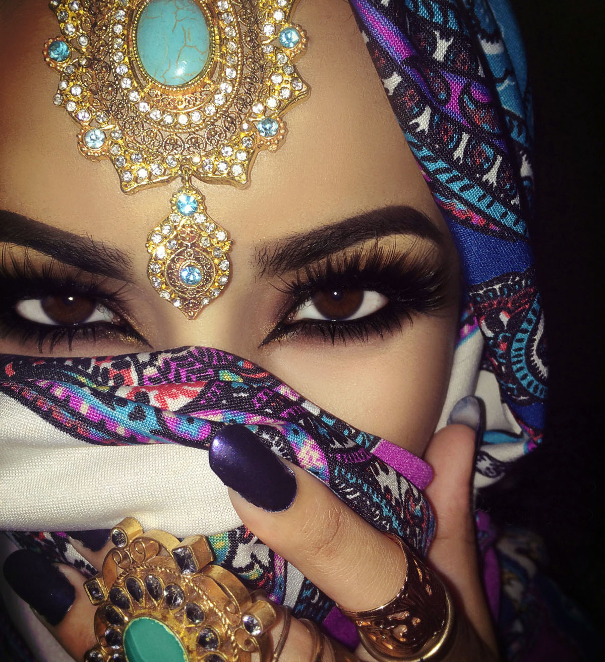 Макияж в арабском стиле — это размашистые стрелки и густые смоки, яркий акцент на глаза и губы, использование насыщенных оттенков, а иногда даже страз и блесток. Выглядеть как главная героиня «Аладдина» помогут наши советы