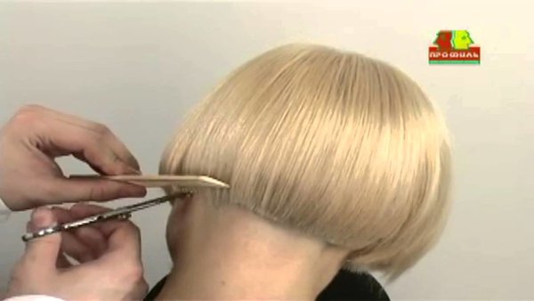 - Волосяные пряди ниже полученной линии стригите одним захватом, расчешите вниз и выполните окантовку по овальной линии.