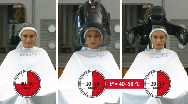 Время можно сократить до 20–30 минут, используя сушируар или климазон при температуре 40–50 °С. По истечении времени состава локоны высушивают феном досуха.