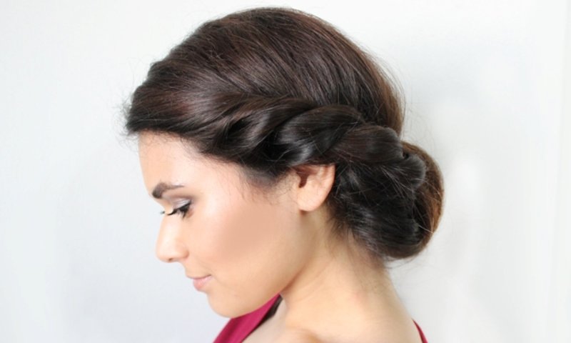 Это симпатичная и формальная прическа, заплетенная вверх. Волосы собраны в хвост и заплетены в косу, а затем скручены в пучок. Чтобы вылет не касался лица, можно использовать насадку для волос.