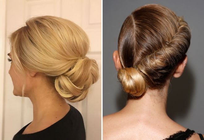 Это прически с плетеными низкими пучками, которые выглядят элегантно и формально. Верхняя часть задирается и вместе с нижней булочкой образует крутой и потрясающий каркас.