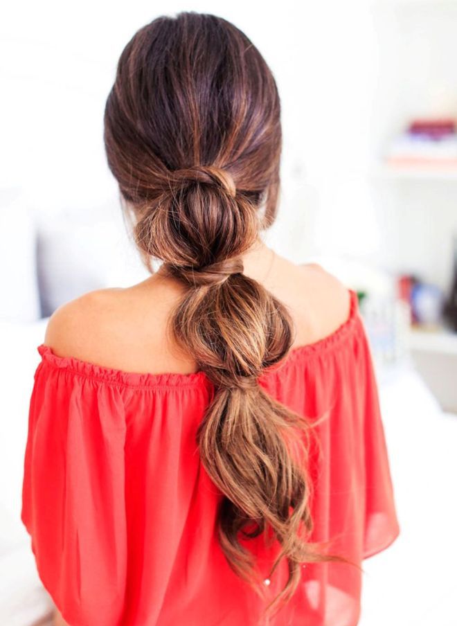 Эффект пузыря «безумно просто, но выглядит сложно» работает и на конском хвосте. Мы советуем закрепить пони по направлению к макушке, создать несколько пузырей по пути вниз (чтобы действительно продать эффектный конечный продукт), а затем закрепить его примерно на 10–15 см до кончиков.![]()
