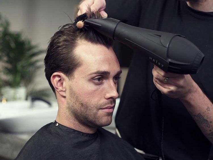 Как уложить мужчине волосы набок? Нанесите на пряди немного пенки или мусса, отделите основную массу волос боковым пробором и просушите весь объем феном, создавая форму при помощи круглой расчески.