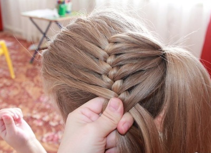 - На каждом этапе вплетайте по пряди из всей массы волос и из хвостика, так продвигайтесь по всей голове.