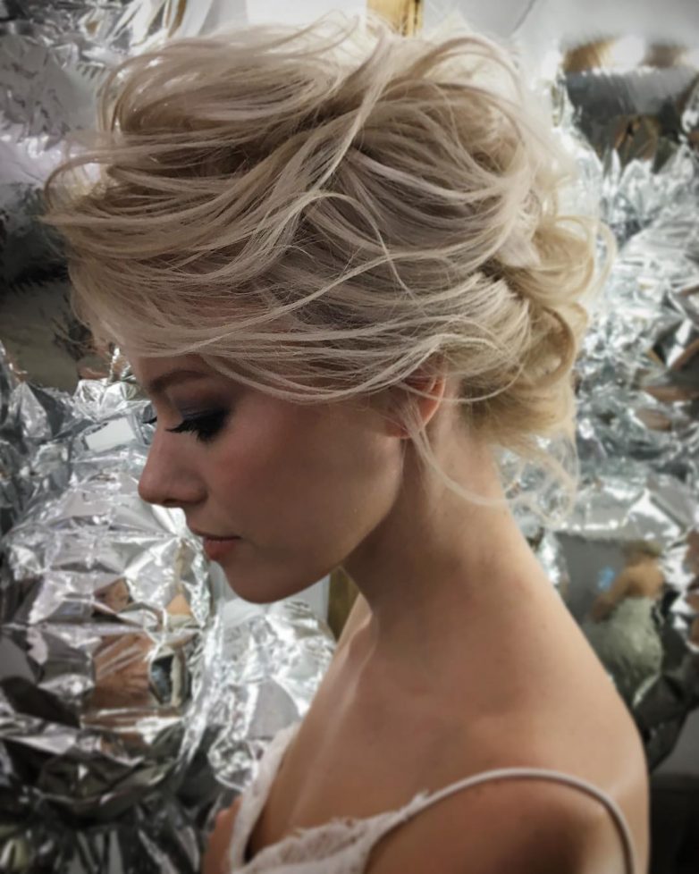 Пучок из коротких локонов получится небрежным, красиво растрепанным. Можно выпустить несколько прядей у лба — будет романтично. Украсить пучок можно объемной сверкающей заколкой или атласной лентой в тон наряду.