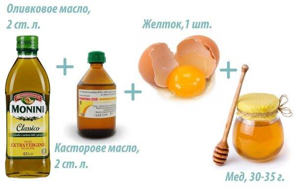Состав: 1 столовая ложка масел (оливкового, касторового), 1 чайная ложка сока одного лимона, 2 желтка.