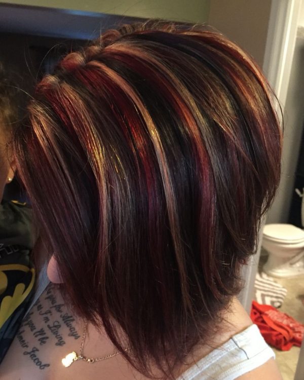 Если вы любите привлекать внимание, вам понравится эта идея с ярко-красными акцентами на темно-каштановых волосах.