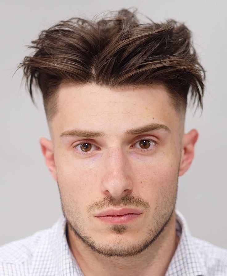 Кому подойдет: молодым людям с густыми прямыми волосами. Создаёт овал, поэтому идеально подходит для круглолицых. Главное – создать объём на темени, а виски с затылком не стричь слишком коротко. Треугольному лицу чёлку лучше зачёсывать назад, виски сделать максимально короткими.