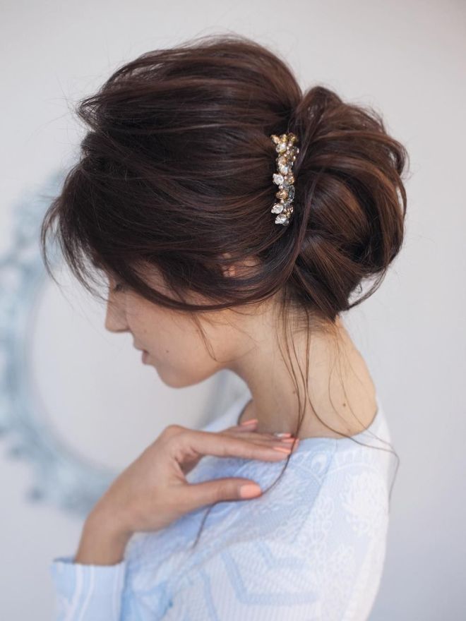 Следующий вид пучка лучше всего создавать на слегка начесанных или завитых волосах, ведь в этом случае прическа получится максимально естественной и объемной.