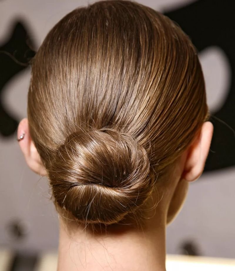Гладкие пучки можно сделать просто огромными, если при их создании воспользоваться специальным бубликом. Такие укладки отлично смотрятся на контрасте с повседневной одеждой, придавая образу изюминки.