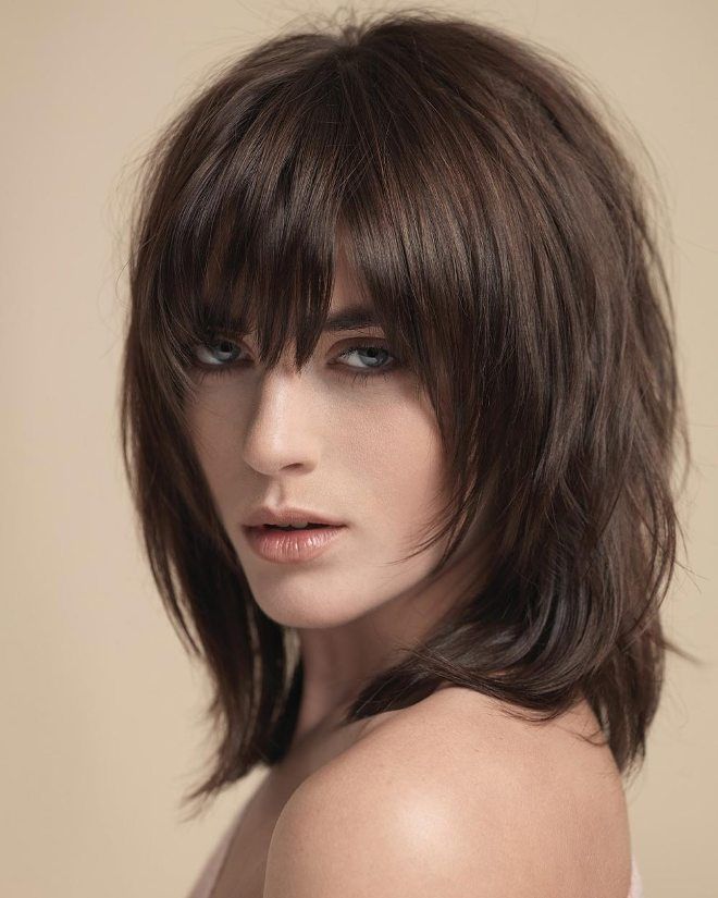 Небрежная миди достигается за счет редких и коротких тонких слоев, идущих от макушки. Чтобы поднять прическу на ступеньку выше, нанесите отдельные пряди оттенка на несколько уровней светлее, чем ваш основной цвет.