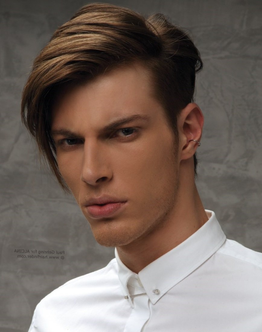 - Если линию лба необходимо немного скорректировать, мужская прическа с челкой на бок станет отличной альтернативой.